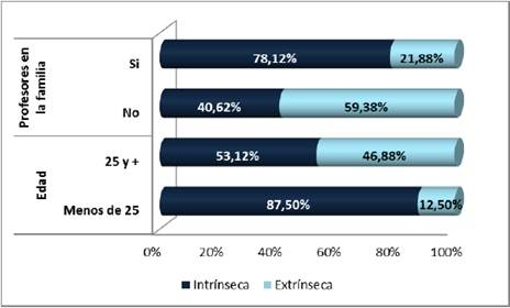 Por otra parte, en casi la totalidad de los estudiantes menores de 25 años ha prevalecido la motivación intrínseca al momento de optar por la carrera docente (87,50%), mientras que en los mayores de 25 años la motivación se distribuye en forma más equitativa, esto es motivación intrínseca (53,12%) y extrínseca (46,88%).