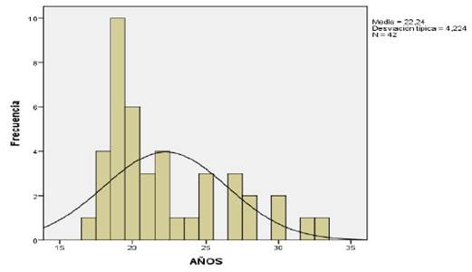 Podemos advertir, además, que el grueso de los estudiantes ingresó con una edad que oscila entre los 17 y 20 años (50%), lo que deja en evidencia una manifiesta continuidad de los estudios culminados en la Enseñanza Media. El grupo de estudio tiene una edad promedio de 22.24 años, presentando una desviación típica de 4.22 años, lo que se aprecia en el Gráfico 2.