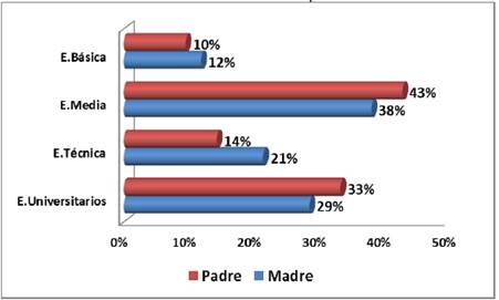 En primer lugar, los porcentajes de padres y madres con formación universitaria (Gráfico 4) son significativos, ya que un 33% de los padres y un 29% de las madres poseen este nivel educacional, lo que estaría señalando que en más de un tercio de los hogares de los estudiantes existe un padre o una madre profesional. Asimismo, un porcentaje importante de padres finalizó la enseñanza media en el contexto de una educación formal.