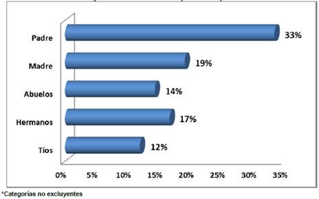 En segundo lugar, casi el 60% de los encuestados declara tener familiares vinculados al ejercicio de la profesión docente, siendo la madre (19%) y el padre (33%) los que lideran dicho orden porcentual. En menor grado se aprecia la presencia de abuelos y abuelas, tíos y tías y hermanos y hermanas dedicados a la Pedagogía.