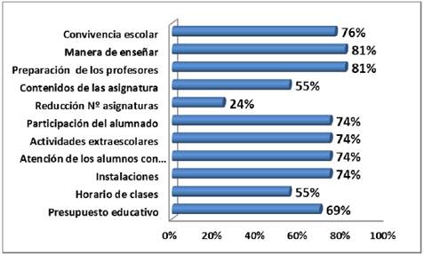 Por otra parte, solo un 26% de los estudiantes considera que la sociedad valora el trabajo del profesorado. Desde el punto de vista de las críticas al sistema escolar que efectúan los encuestados, se puede señalar que la labor docente y la preparación de la enseñanza son los aspectos más cuestionados, con altos porcentajes de desaprobación. Este dato deviene de la propia realidad educativa percibida de forma directa por sus actores centrales.