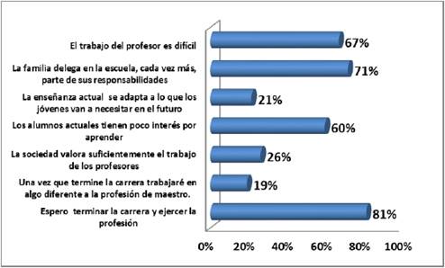 No obstante, un alto porcentaje de los encuestados (81%) espera terminar la carrera y ejercer la Pedagogía, situación corroborada en el ámbito nacional en la que sobre el 70% de los estudiantes que han egresado de estas carreras laboran en la especialidad educativa que siguieron (Peirano, 2009).