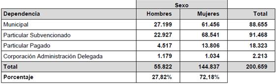 Esto impone la necesidad de examinar las características generales de quienes serán profesores y profesoras, en función de su impresión acerca del sistema educativo y las motivaciones personales que los impulsaron a ingresar a dicho campo laboral. Ahora bien, en el sistema formal se sabe que la docencia es una profesión altamente feminizada, donde el porcentaje de varones en ejercicio no supera el 30% del profesorado a nivel nacional. De igual forma, en nuestro país la mayoría de los y las estudiantes (68%) que cursan carreras pedagógicas son mujeres (Bravo, Peirano y Falck, 2006). La relación de docentes según sexo se puede apreciar en el Cuadro 1: