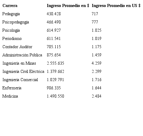 Por otra parte, aunque sus remuneraciones han ido mejorando a través de los años, las posibilidades de una mejora sustantiva a lo largo de la carrera laboral son muy limitadas (Núñez, 2007). En este contexto, cabe precisar que las y los profesores que ingresan al sistema educacional formal son los profesionales que tienen un menor nivel de ingreso promedio al cabo de un año entre las carreras profesionales que se imparten en Chile. Lo antes señalado se aprecia en el Cuadro 2: