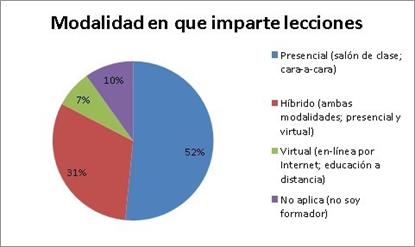 La mayor parte de las personas de la muestra imparte lecciones, solamente 8,9% no ejerce labores de formación, mientras que 51,6% lo hace de modo presencial; 31,1% de manera híbrida (presencial y virtual) y 7,5% de manera virtual (figura 1). En cuanto al rol que ejercen, 47,1% se dedica a profesorado/cátedra/docencia y 14,1% al profesorado/investigación; 7,8% es estudiante y 7,5% es administrativo. Asimismo, 5,5% trabaja en capacitaciones de alguna organización no gubernamental (ONG) o sociedad civil; 4,7% es directivo académico o se dedica a la academia/investigación; 2,4% es empresario privado y 1,6% a la bibliotecología.