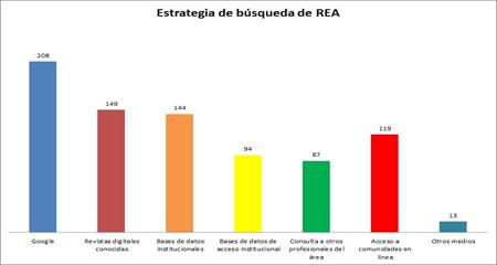 Acerca de las estrategias de búsqueda de REA, se resalta entre las personas participantes el uso de Google. En menor proporción, se señalan otros medios como las revistas digitales conocidas, las base de datos propias de las instituciones en las que laboran o bien aquellas a las que tiene se acceso desde su institución.