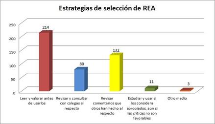 Sobre este punto, se obtuvo que 214 participantes primero leen los textos para valorar los REA antes de usarlos. Además, hubo 132 respuestas referentes a revisar comentarios que otros han realizado respecto al REA para seleccionarlo, número que corresponde a más de la mitad de la muestra.