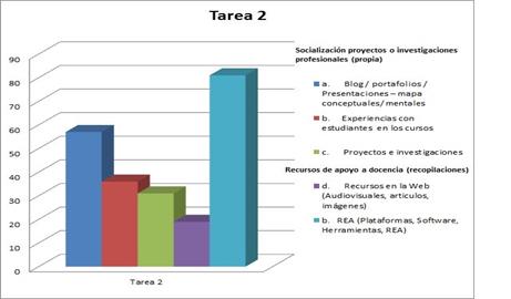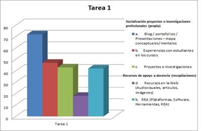 De las 256 personas participantes, 222 entregaron tareas durante la primera semana del MOOC; de este grupo se encontró que 162, lo que representa 73% del total de las tareas entregadas, evidenciaban la socialización de actividades, proyectos e investigaciones propias relacionadas, en su mayoría, con su profesión y su función docente. De estas tareas, 72 participantes las realizaron a través de una presentación, mapas conceptuales, blogs, portafolios entre otros. Para ello, utilizaron algunas herramientas como Prezi, Power Point, Slideshare, CmapTool y Blogger. Además, 47 personas compartieron experiencias de clases y con sus estudiantes; 43 socializaron proyectos como folletos de ejercicios, prácticas, tutoriales, audiovisuales, artículos carteles e investigaciones en general.