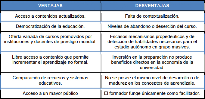 Las ventajas y desventajas de la aplicación de MOOC señaladas en la tabla 1 deben ser valoradas para tomar decisiones con respecto a la utilización de este tipo de cursos, tales como los objetivos de aprendizaje, duración, requerimientos y la población a la que está dirigida.