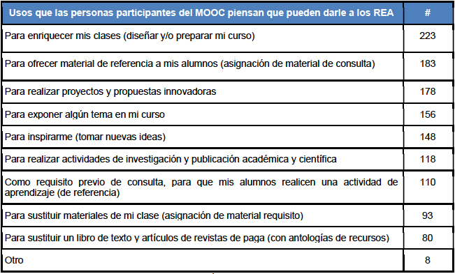 Aunque los participantes del MOOC todavía se encontraban en las primeras fases del uso de los REA, la perspectiva de utilizarlos en el futuro para innovaciones propias, brinda una proyección amplia de los potenciales alcances de la formación de estos profesionales en el tema. Más importante aún, esta perspectiva puede influir en los REA que eligen para su práctica.