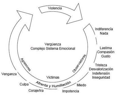 Se concluye que esta situación de maltrato entre iguales puede tornar la violencia entre iguales en un círculo interminable (Figura 1) en el que alumnos y alumnas tratan de superar la vergüenza por la afrenta recibida utilizan la violencia en un intento de recuperar su propia valía ante sí mismos/as y ante los ojos del resto de sus compañeros de escuela y de esta forma recobrar el orgullo. Como se expresó en párrafos anteriores en palabras de Gómez "la violencia es la catarsis de la vergüenza" (Gómez, 2005, p. 131). Las personas agresores van descargando su resentimiento hacia otras; las víctimas que como se mencionó, a su vez, guardan su resentimiento en espera de una revancha, para cuando el diferencial de poder de su agresor sea menos, o cuando ellos estén más grandes, o en su caso la víctima deja de ser pasiva, para volverse una persona violenta, con la esperanza de que así no será nuevamente agredida; con respecto a los observadores, utilizan la agresión como una forma de evitar ser víctimas. Un hecho que nos parece claro es que la violencia aumenta la vergüenza y viceversa, es decir, se amplifican mutuamente