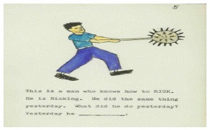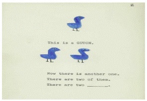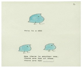 This example tries to prove that children are born with a language acquisition device (LAD) mentioned in the previous paragraph. In addition, Berko´s Wug test challenges to examine the child´s use of morphological rules of different types, under varying phonological conditions for native speakers. To do this, a series of nonsense words are invented or made up, following the rules for possible sound combinations in English. Picture-like colorful cartoons are depicted that show animals, objects, and people in action (Berko, 1958). The following hand-drawn images are examples of the original Wug test: