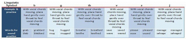Likewise, similar practices are provided for voiced consonants as the ones in the previous chart that indicates that voiced consonants happen when the vocal chords vibrate. English Language Learners (ELLs) touch their vocal chords and feel the vibration of the verbs in their simple forms so that they can understand what voiceless and voiced consonants are (Avery & Ehrlich, 1992; Bowen & Marks, 1992). This is done to help students understand that when the verb ends in a voiced consonant and that when the -ed is placed, this ending is pronounced /d/.