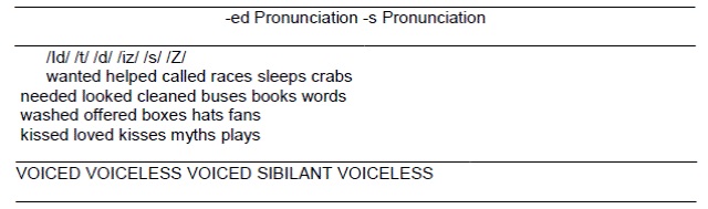 The pronunciation of the plural of nouns, the past tense ending of regular verbs, the possessive forms, and the third person singular of the simple present tense can be explained in the table 1: