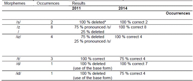 The results portrayed in table 3 have demonstrated the progress of Itzel's use of the morphemes after three years. In 2011 Itzel was immersed in an English-speaking environment in Utah. Her use of the morphemes ranged from 0 to 25 %. In the test performed by Itzel in the year 2014 revealed that the use of the morphemes ranged from 75 % to 100 %; the only two morphemes that were pronounced 75% correct in four occurrences or instances were the morphemes /t/ and /Id/. The child did not substitute the morpheme, that is, she simply did not pronounce it.