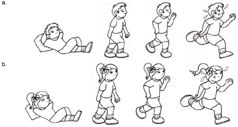 Cada pregunta tiene cuatro posibles respuestas, que representan un estadio del nivel de actividad física: sedentario, poco activo, activo o muy activo. Para cada uno de esos estadios de actividad física se diseñó un dibujo sin gestos faciales de un niño -para el instrumento de hombres- y una niña -para el instrumento de mujeres- (ver Figura 1) y se incorporaron como una escala en cada pregunta. El puntaje de cada pregunta tiene un rango de 1 a 4 puntos: un punto para el dibujo de sedentario, dos puntos para poco activo, tres puntos para activo y cuatro puntos para muy activo.
