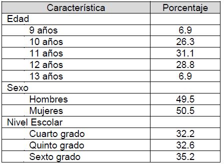 Se obtuvo los permisos del Ministerio de Educación Pública de Costa Rica, de las direcciones de los centros educativos correspondientes y de las maestras de cuarto, quinto y sexto grado. Finalizada esta etapa se procedió a realizar una selección aleatoria simple de los grupos por nivel, que conformaría la muestra por escuela. Seguidamente, se les envío el consentimiento informado a todas las personas encargadas de los niños y las niñas de cada grupo seleccionado y se obtuvo el asentimiento del menor. Participaron en esta investigación únicamente aquellos niños o niñas que tuvieran firmado el consentimiento y el asentimiento correspondientes. En la Tabla 1 se muestra los descriptivos de la muestra en cuanto a edad, sexo y nivel escolar.