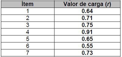 La varianza total explicada de este análisis fue de 70%, evidenciándose que el máximo de dimensiones que se admite para esta prueba es de una. Cabe mencionar que los datos superaron las pruebas de adecuación muestral de Kaiser-Meyer-Olkin (pero, en este caso, el valor de la prueba estuvo entre 0.6 y 0.7 por lo que, si bien es un resultado moderado, no alcanzaría a ser adecuado para un análisis con más de un factor, dada la fuerte estructura monofactorial del instrumento) y de esfericidad de Bartlett, por lo que los datos satisfacen los criterios para considerar adecuado un análisis factorial de componentes principales (Meyers, Gamst y Guarino, 2013).