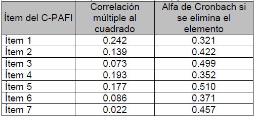 La consistencia interna fue establecida por el alfa de Cronbach, dando como resultado en un coeficiente α = 0.637 (n = 742) el cual se puede interpretar como aceptable para fines científicos (Celina y Campo, 2005; Meyers, Gamst y Guarimo, 2013). En la Tabla 3 se muestran los estadísticos de confiabilidad incorporándose también la eliminación de ítems para el instrumento C-PAFI. Se aprecia cómo, en los ítems del C-PAFI tienen relaciones similares con la escala total. Además, no se aumenta la confiabilidad del instrumento al eliminar cualquiera de los ítems.