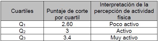 Al analizar por cuartiles, el nivel de actividad física de la muestra de estudio luego de aplicar el cuestionario C-PAFI, se encontró que un 75% de los niños y niñas encuestados presentan niveles de actividad física por debajo de 3.4 puntos, y únicamente el 25% de los valores observados están por encima de ese valor. Asimismo, un 25% de los valores observados están por debajo de 2.60 puntos. La población infantil de este estudio con niveles de actividad física bajos (sedentarios) están con valores totales por debajo del 2.60 puntos en el cuestionario (ver Tabla 4).