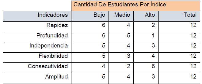 Los resultados del análisis de los índices cuantitativos establecidos para la muestra evidenciaron que la cualidad de consecutividad del pensamiento se encuentra en un nivel alto de desarrollo, mientras que las demás cualidades en un nivel medio, de acuerdo con los valores de dichos índices que fueron de 2,16 para la consecutividad, y se comportaron entre 1,6 y 2 para la mayoría de las cualidades, con excepción de la profundidad del pensamiento que alcanzó solo el valor de 1,58.