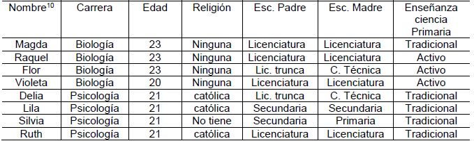 Todas las estudiantes entrevistadas cursaban sus estudios en una Facultad multidisciplinaria situada en los márgenes de la Ciudad de México, eran solteras y contaban entre 20 y 23 años; no tenían hijos/as y vivían con su familia de origen. Las cuatro estudiantes de biología y una de psicología no profesan ninguna religión, mientras que tres estudiantes de psicología se declaran católicas. Todas las jóvenes manifiestan haber tenido un excelente desempeño académico durante su educación primaria y seis de ellas cuentan con al menos un progenitor que cursó estudios universitarios. En la tabla 1 se pueden observar algunas características de las estudiantes entrevistadas.
