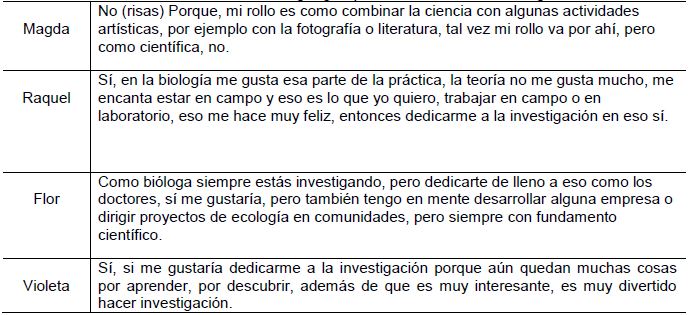 Si bien carreras como biología tienen como eje la investigación científica, no todas las chicas que estudian esta carrera optan por dedicarse a esta actividad. De las cuatro estudiantes de Biología, tres de ellas aspiran a dedicarse a la investigación científica y afirman que la investigación es una actividad divertida, que las hace felices. En cambio Magda, quien es la única estudiante de la carrera de Biología que rechaza la idea de dedicarse a la actividad científica, considera que la investigación no es una actividad que le interese, pero manifiesta su interés por combinar la ciencia con el arte. En la tabla 2 se pueden apreciar las respuestas de las entrevistadas: