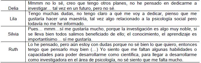 A su vez, las estudiantes de psicología tienen serias dudas respecto a considerar la investigación científica como su proyecto de futuro, tres de ellas consideran más bien tomar otras vías y únicamente Silvia parece estar convencida de que la carrera científica le ofrece un panorama alentador y manifiesta su intención de dedicarse a la investigación. En la tabla 3 se puede apreciar las respuestas de las estudiantes de psicología respecto a sus perspectivas para dedicarse a la investigación: