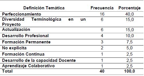 Como se observa en la Tabla 2, en los estudios predomina el concepto de perfeccionamiento, 40% de los reportes concatena FPP con perfeccionamiento. En suma, actualización es el concepto asociado que aparece en un 15%.