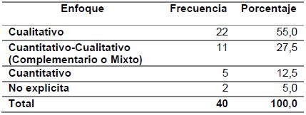 En el ámbito metodológico, se observa que priman los estudios de carácter cualitativo con 55%, sobre los estudios que involucran métodos complementarios (cuantitativocualitativo) con 27,5%, más aún, sobre los estudios de orden cuantitativo (12,5%). Los alcances de los estudios, en un 30%, son descriptivos. En baja medida se encuentran investigaciones de tipo hermenéutico y fenomenológico, a pesar de que el 55% de los estudios son de enfoque cualitativo (ver Tabla 3).