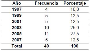 En el ámbito contextual, se observa un incremento significativo de la investigación en FPP entre los años 2003 y 2005 (Ver Tabla 4). De igual forma, se observa un porcentaje equilibrado en cuanto al género de los investigadores e investigadoras. Por otra parte, las investigaciones tienden a ser de carácter disciplinar, involucrando la perspectiva interdisciplinaria en solo 2 estudios de los 40 analizados.