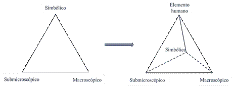 Aunque la actividad comunicativa-simbólica es una de las manifestaciones subjetivas del ser humano más desarrollada y útil, la actividad pedagógica no puede quedar estancada en el vértice simbólico, principalmente por parte del docente. Por ejemplo, una excelente oportunidad para abordar el dominio macroscópico de la química, ciertamente, son las actividades experimentales. Sin embargo, debemos evitar reducirlas a actividades de comprobación para refuerzo de las clases teóricas, pues podrían disminuir o perder su utilidad didáctica (Benarroch, 2010; Izquierdo, 2004; Nakamatsu, 2012). El acercamiento a la fase experimental de la química implica más que solo observar un fenómeno, ya que es una excelente oportunidad para que el estudiante conozca cómo los químicos trabajan y actúan ante esos fenómenos y, a la vez, cómo lo observable se explica y teoriza en conocimiento científico. Es decir, cómo se realiza la conexión o desplazamiento hacia los niveles submicroscópico y simbólico, ya que lo que se observa a nivel macroscópico es un reflejo de lo que ocurre a nivel submicroscópico, lo cual también debe representarse con herramientas lingüística (símbolos, ecuaciones químicas, cálculos matemáticos,…).
