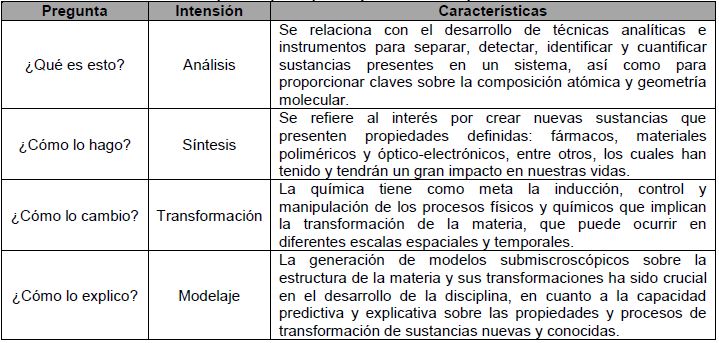 En los dos apartados anteriores se planteó la necesidad de ir más allá de los contenidos del currículo de química, en el sentido de contextualizarlos de acuerdo con las realidades a las que se exponen nuestros estudiantes día a día (la cotidianidad) y los acontecimientos de nuestro mundo, a modo de abordar cada uno de los niveles de pensamiento y mostrar una imagen más adecuada de esta ciencia. Como se ha mencionado, la química es una ciencia amplia cuyo campo de estudio es la materia y, de acuerdo con Talanquer (2009), tiende a dar respuesta a cuatro preguntas fundamentales (tabla 1). Este autor, plantea que estas preguntas son cruciales para comprender y prever el presente y futuro de la química, así como los de su enseñanza.