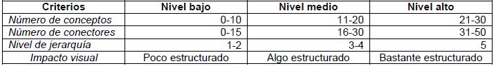 En relación con el primer instrumento de evaluación, los criterios de valoración que se han tenido en cuenta han sido los siguientes: número de conceptos; número de conectores; nivel de jerarquía; relaciones entre los conceptos; impacto visual y calidad de los conceptos y de las frases. Los criterios de evaluación considerados parten de estudios anteriores planteados por varios autores (Fernández y Rodríguez, 1995; Miller et al., 2009; Rivadulla et al., 2015). Por otra parte, estos criterios de valoración llevan asociado un sistema de puntuación, de manera que han generado 3 escenarios de evaluación (bajo, medio, alto), como puede verse en la Tabla 1 y sus correspondientes ejemplos en las Figuras 1, 2 y 3.