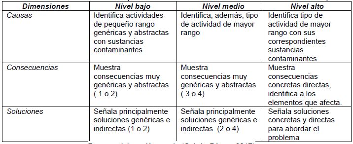 Otro criterio de evaluación tomado en cuenta ha sido el de las relaciones entre los conceptos, se valora una serie de unidades de significado identificadas en los mapas, las cuales se corresponden con las siguientes dimensiones: causas (las causas que originan la contaminación del agua); consecuencias (las consecuencias que provoca la contaminación del agua) y soluciones (las soluciones propuestas para prevenir y disminuir la contaminación). Por otro lado, según la adecuación de las relaciones a las dimensiones de las unidades de significado, se han generado 3 niveles: bajo, medio y alto, tal como puede observarse en la Tabla 2 y en las Figuras 4, 5 y 6.