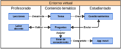 El entorno virtual permitió la interacción de los elementos: estudiantado, profesorado, aplicaciones móviles y los contenidos temáticos, guiados por una intencionalidad pedagógica. Las interacciones entre ellos fueron formales durante el tiempo de las lecciones, pero, fuera de las horas del curso, estas se realizaron de manera informal y asincrónica, cada participante interactuaba en el instante que consideró pertinente.