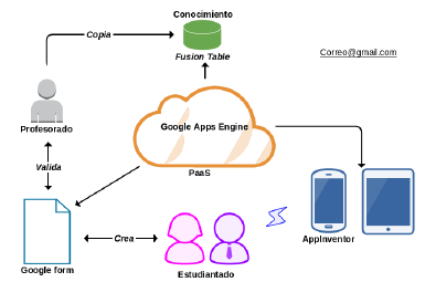 Las cualidades anteriormente descritas son suplidas de forma completa, simple y libre en la plataforma de Google AppsEngine, tal como se mencionó anteriormente. Entre los servicios utilizados se destacan: el correo electrónico, Google Docs y Google Drive. Mediante estas herramientas se crea un formulario compartido como enlace con los discentes para que suban los ítems creados. Posteriormente, la información del formulario es colocada de forma automática en otro documento de tipo tabla dinámica (tabla de fusión) de Google doc que tiene como función servir de base de datos o repositorio global con la información compartida.