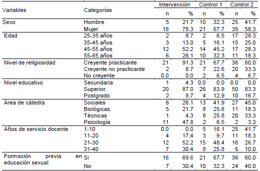 Debido a la prevalencia de psicólogos educativos en los grupos, se les consideró una categoría aparte. En los grupos intervención y control 1 predominan las siguientes características: sexo femenino, entre 45-55 años, creyentes, personas con título superior de Ciencias Sociales, predominantemente psicólogos que tienen entre 21-30 años en la docencia y que no han tenido formación en educación sexual. En el grupo de control 2 su edad media es menor, hay un grupo importante de áreas técnicas, formación de posgrado, y menos años de servicio docente. Se detectó que algunos de los encuestados que indicaron haber recibido capacitación en educación sexual han asistido a conferencias sobre educación sexual programadas por la dirección de educación de la provincia.
