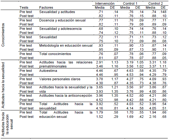 Al comparar los resultados entre todos los tres grupos para constatar la eficacia de la intervención y observar en qué grupos se dieron las mayores mejoras, se encontró los siguientes resultados según ANOVA one way: con respecto el total de conocimientos se encontró diferencias significativas entre todos los grupos, F (2, 111) = 29.69, p<.001; y específicamente en los ejes de sexualidad y actitudes, F (2, 111) = 9.48, p<.001; docencia y educación sexual, F (2, 111) = 11.64, p<.001; sexualidad y adolescencia, F (2, 111) = 20.46, p<.001; sexualidad, F (2, 111) = 35.95; p<.001 y en metodología en educación sexual, F (2, 111) = 2.86; p = .06. Se usó Bonferroni post hoc para conocer diferencias entre cada par de grupos; se encontró diferencias significativas, con tamaños de efecto grande entre el grupo de asistentes al curso y el grupo control 2 en docencia y educación sexual, I-J = -.07, p<.05, d =