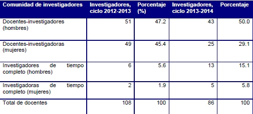 Sin embargo, en esta disminución se puede observar un impacto más importante en el número de docentes-investigadoras mujeres que en el número de docentes-investigadores hombres, ya que en el primer ciclo éstas representaban el 45.4% del total, mientras que en el segundo apenas alcanzan el 29.1%. Algo similar ocurre en la categoría investigadoras de tiempo completo, pues en ambos periodos es mucho menor que el de investigadores de tiempo completo, en 2012-2013 existe una diferencia de 3.7 puntos porcentuales favorables a los hombres, y en 2013-2014 es del 9.3 puntos porcentuales (Tabla 4).