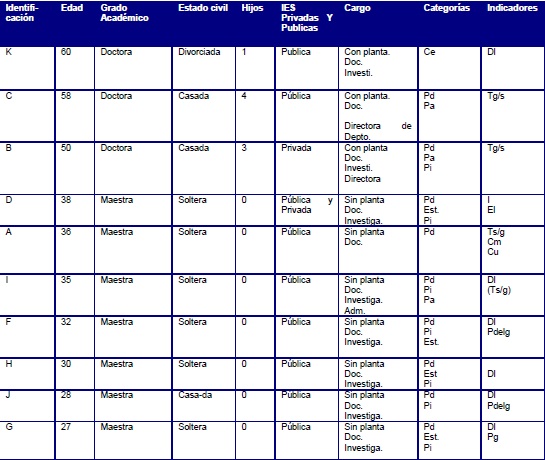 De las mayores, una se desempeñaba como profesora de tiempo completo con planta y como directora de departamento en una IES pública, tenía grado de Doctora; estaba casada desde hacía casi tres décadas y tenía cuatro hijos. Otra era profesora Titular Nivel Uno e investigadora en una IES privada, con grado de Doctora, habiendo ocupado el cargo de Directora Académica; estaba casada hacía 25 años y tenía 3 hijos. Otra era docenteinvestigadora con grado de Doctora, en una IES pública; estaba divorciada y tenía una hija.