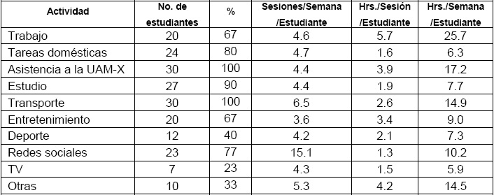 Sobre la base de la información obtenida, la Tabla 1 muestra las actividades que forman parte de las rutinas estudiantiles, en consideración a: el número de estudiantes que las declara; el promedio de sesiones a la semana por estudiante; el promedio de horas por sesión, por estudiante; y el promedio de horas dedicadas a cada actividad, por semana y por estudiante.