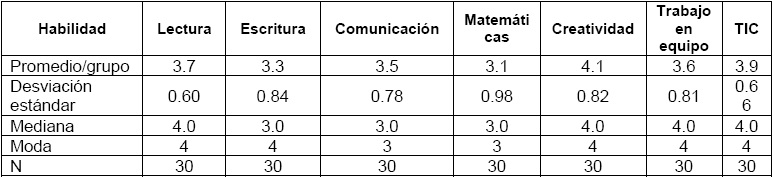 La Tabla 2 sintetiza la apreciación del estudiantado, en conjunto, sobre el nivel que poseen en cada una las siete habilidades consideradas. Como puede observarse, el promedio de calificación es regular para matemáticas y escritura; de regular a bueno, en comunicación, trabajo en equipo y lectura; y bueno, con respecto a TIC y creatividad. Así pues, sus mayores deficiencias las perciben en matemáticas y escritura; confían en sus habilidades de lectura, comunicación y trabajo en equipo; y piensan que son bastante buenos en cuanto a TIC y creatividad.