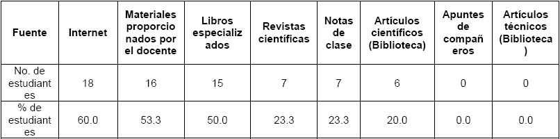 De acuerdo con las respuestas recabadas, los tres principales medios fueron: primero, Internet (60.0%); segundo, materiales proporcionados por el docente (53.3%); y tercero, libros especializados (50.0%). Menos de la cuarta parte del estudiantado incluye las revistas científicas (23.3%), las notas de clase (23.3%) y los artículos científicos (20.0%); y ninguno, los apuntes de compañeros y los artículos técnicos. Sin embargo, arriba del 40% del estudiantado se pronuncia por las revistas científicas o los artículos científicos. La preferencia por Internet podría asociarse con las señaladas habilidades del alumnado en el manejo de las TIC, así como con la accesibilidad, versatilidad, facilidad y bajo costo que brinda la Red. No obstante, el estudiantado que utiliza esta vía pueden limitarse a buscar, copiar y pegar textos e imágenes, sin llegar a aprovecharla para verdaderos o mayores propósitos de estudio.