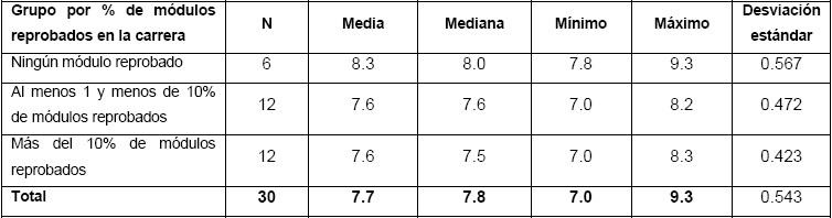 De tal forma, en las postrimerías de la carrera, el desempeño académico de más del 80% del estudiantado del grupo era de regular a bajo, con 8 o menos de promedio de calificaciones, y/o uno o más módulos reprobados. El porcentaje general de reprobación fue de 11.6% de los módulos cursados.