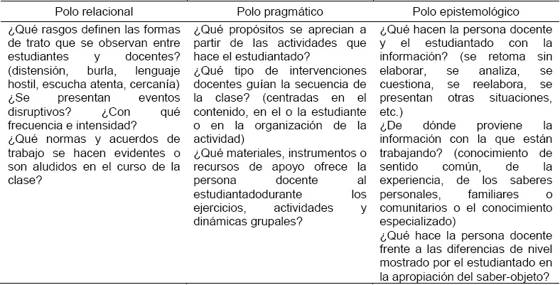 Así, el análisis del polo de tensión epistemológico ofrecerá elementos para que las personas docentes reflexionen sobre la manera en que acompañan al estudiantado en su progreso curricular. A la vez, se evidencia la manera en que la agenda “formativa”, esto es, la apropiación de formas de trato entre el estudiantado, corre en paralelo con el dominio de saberes o la manipulación de objetos. La reflexión desde la dimensión relacional pone de manifiesto cuánto de la vida en las aulas se juega en función de los términos de referencia que las personas docentes establecen con sus estudiantes, así como de la manera de atender las disrupciones, tensiones o conflictos que surgen de la vida compartida. La cercanía, el aprecio, la capacidad de reconocer y valorar las diferencias individuales del estudiantado y de aprovecharlas como recurso pedagógico son, entre otros, asuntos que esta dimensión releva.