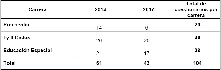 En total, se aplicaron 104 instrumentos con preguntas abiertas y cerradas, cuyo objetivo fue consultar la identificación que el estudiantado posee con el ser docente, el reconocimiento social que, a su criterio, recibe esta carrera y la reacción familiar ante su escogencia profesional. La selección del estudiantado participante fue la población disponible en el momento que se aplicó el instrumento, y que cursaba el nivel de Diplomado. Se aplicaron por tanto, 61 instrumentos en el año 2014 y, tres años después, en el año 2017, 43 instrumentos a los mismos grupos cuando las y los estudiantes participantes cursaban niveles avanzados en sus respectivas carreras. En la Tabla 1 se presenta la distribución de dichos estudiantes según carrera en los dos momentos de aplicación del instrumento.