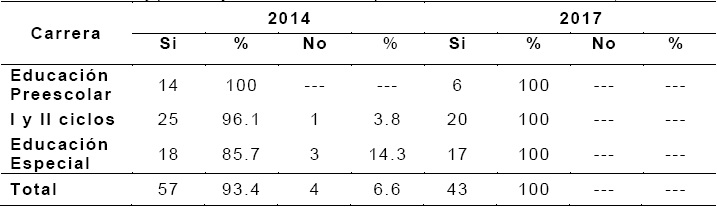 Con respecto a la interrogante que apunta a conocer la opinión del estudiantado participante con respecto a “¿Se identifica usted con ser docente?”, en la totalidad de las respuestas obtenidas, esta identificación aumenta conforme avanza el proceso de formación universitaria, tal como se aprecia, para el año 2014, el 93.4% de las respuestas fue afirmativa, mientras que para el año 2017, el porcentaje de respuestas afirmativas es un 100%, lo cual incluye la totalidad del estudiantado según se muestra en la Tabla 2, la cual también muestra una diferenciación por carrera.