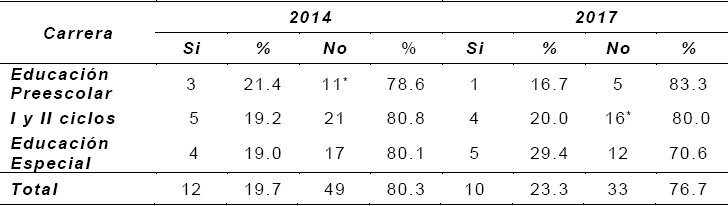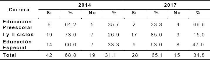 Sin embargo, estos resultados obtenidos se contraponen con los obtenidos posteriormente a partir de la formulación de la interrogante al estudiantado participante acerca de su sentir con respecto a la idea de ejercer la profesión docente durante toda su vida profesional futura. Según se muestra en la Tabla 3, puede decirse que, en la mayoría de las respuestas obtenidas para el año 2014, es decir al inicio de las carreras en el nivel de Diplomado, el 68.8 % manifiesta identificarse con ejercer la profesión docente durante su vida futura. Sin embargo, esta identificación decrece a un 65.1% para el año 2017. Al analizar las particularidades de cada carrera, se observa que en Educación Preescolar hay un mayor decrecimiento, conforme las estudiantes avanzan en su proceso formativo, y parecen identificarse menos con ejercer a futuro la profesión escogida, pues se aprecia un 64.2% de respuestas afirmativas en el 2014, en contraposición a un 33.3 % en el 2017. En la carrera de Educación Especial se observa un 66.6% en el año 2014, el cual decrece a 53% para el año 2017. En la carrera de I y II ciclos, la tendencia, en términos porcentuales, es contraria, pues de 73% en el 2014 aumenta a 85% en el año 2017.