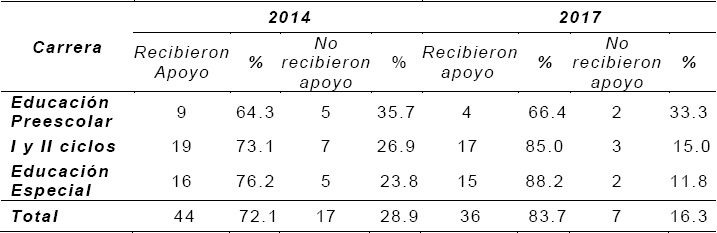 Las respuestas aportadas muestran que el total de estudiantes que recibieron apoyo de sus familias al inicio es 72.1% y 83.7% en niveles avanzados de las carreras en cuestión, lo cual indica que el estudiantado recibe apoyo y una aceptación más positiva conforme avanza en su formación profesional. Esta situación se aprecia claramente en las carreras de I y II ciclos (73.1% contra 81.5%) y de Educación Especial (76.2% contra 88.2%), mientras que en la carrera de Preescolar el apoyo es comparativamente menor desde el inicio de la carrera y este se mantiene con poco aumento (64.3% contra 66.4%) durante su proceso formativo universitario.